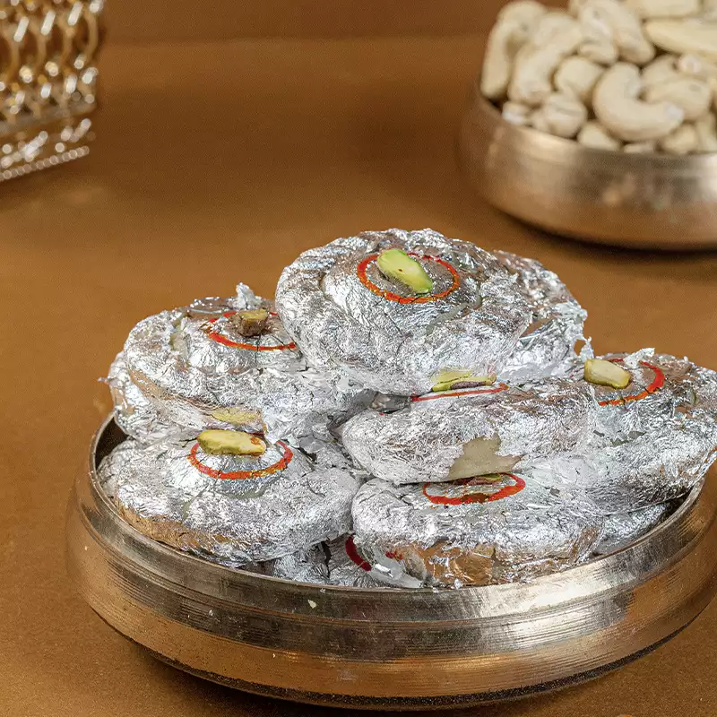 Kaju Chandarkala draws its inspiration from the serene beauty of the crescent moon, and it lives up to its celestial name in every way. This elegantly shaped cashew sweet has the smooth, dreamy texture of the finest kaju katli but is crafted into a distinctive half-moon form that makes it visually striking and instantly memorable. Each piece is made from premium cashew paste, delicately sweetened and finished with a silvery sheen that gives it an almost ethereal quality. Kaju Chandarkala is as much a work of art as it is a sweet, making it the perfect choice for elegant gifting, festive platters, and occasions that call for something truly special.