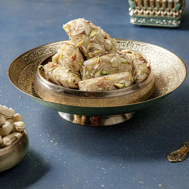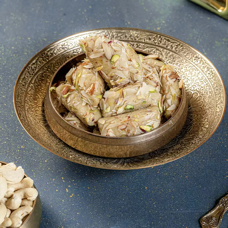 Kaju Gujiya reimagines one of India’s most beloved festive sweets with a generous cashew twist. The classic crescent shaped pastry, traditionally filled with khoya and dry fruits, gets a premium upgrade here with a rich, smooth cashew filling that makes every bite deeply indulgent. The outer shell is perfectly crisp and golden, giving way to the luxurious cashew interior in the most satisfying way. Synonymous with Holi celebrations but enjoyed year-round, our Kaju Gujiya is made fresh and with care, ensuring you get the authentic festive joy in every single piece. A guaranteed crowd-pleaser at any gathering.
