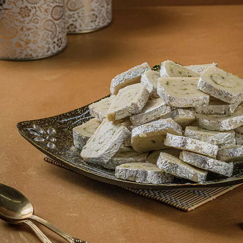 Kaju Pista Cake is a feast for both the eyes and the taste buds. This beautiful two-layered Indian sweet brings together two of the most prized dry fruits, creamy cashews and vibrant green pistachios,in a soft, fudge-like cake that is as gorgeous to look at as it is to eat. The ivory-white cashew layer and the rich green pistachio layer sit together in perfect harmony, offering a subtle contrast of flavors in every bite. Made with pure ingredients and no artificial colors, the stunning natural green of the pistachio layer speaks for itself. A must-have centerpiece for festive mithai boxes, weddings, and premium gifting occasions.